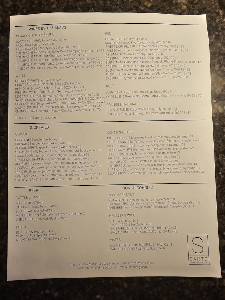 Sante Wine Bar & Bistro Menu (Update 2025)